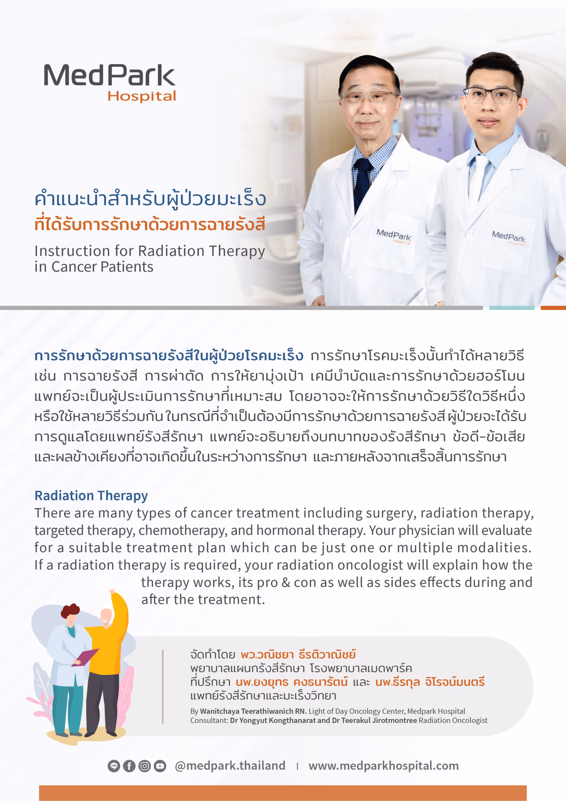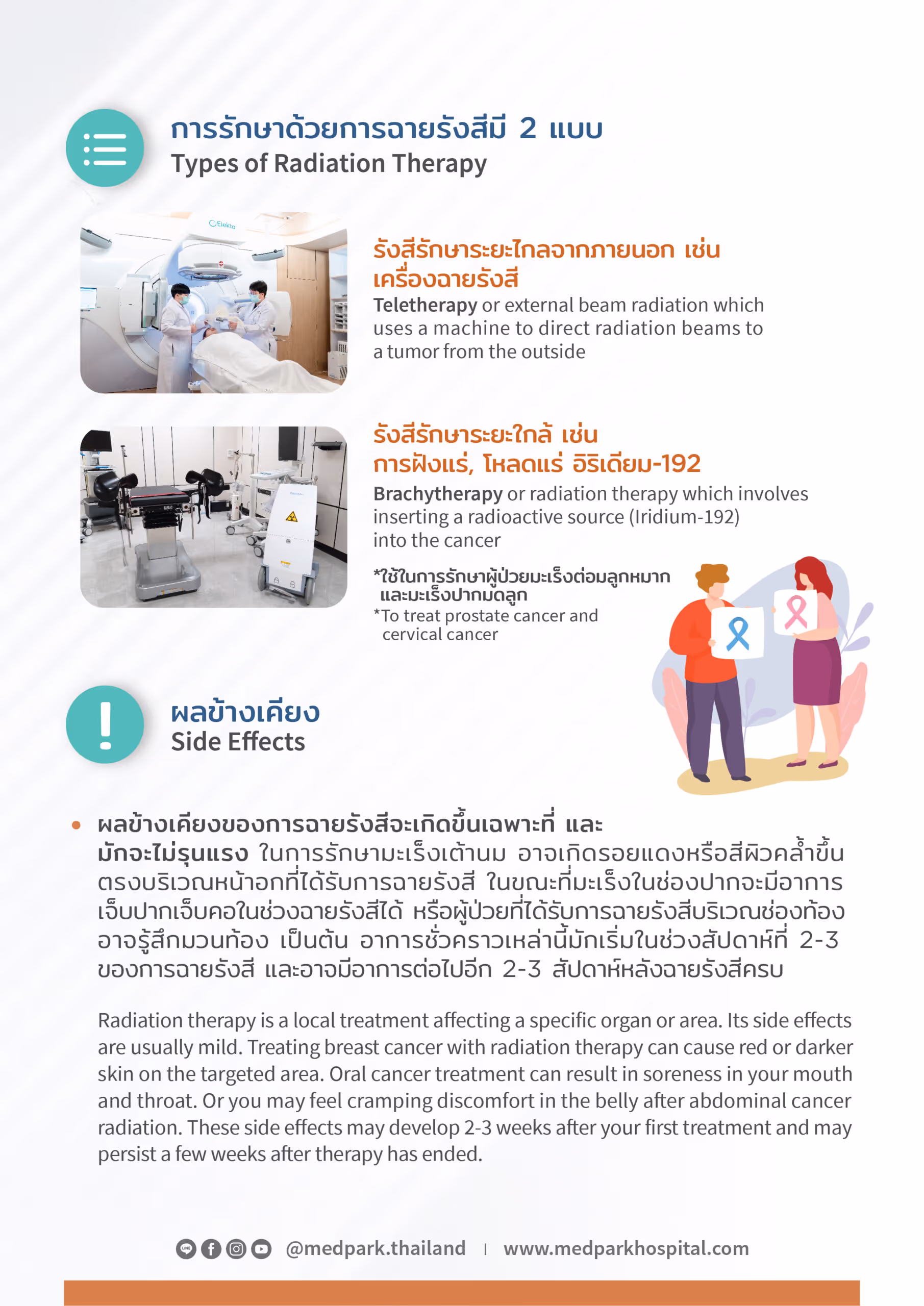 Radiation Therapy There are many types of cancer treatment including surgery, radiation therapy, targeted therapy, chemotherapy, and hormonal therapy. Your physician will evaluate for a suitable treatment plan which can be just one or multiple modalities. If a radiation therapy is required, your radiation oncologist will explain how the therapy works, its pro & con as well as sides effects during and after the treatment.