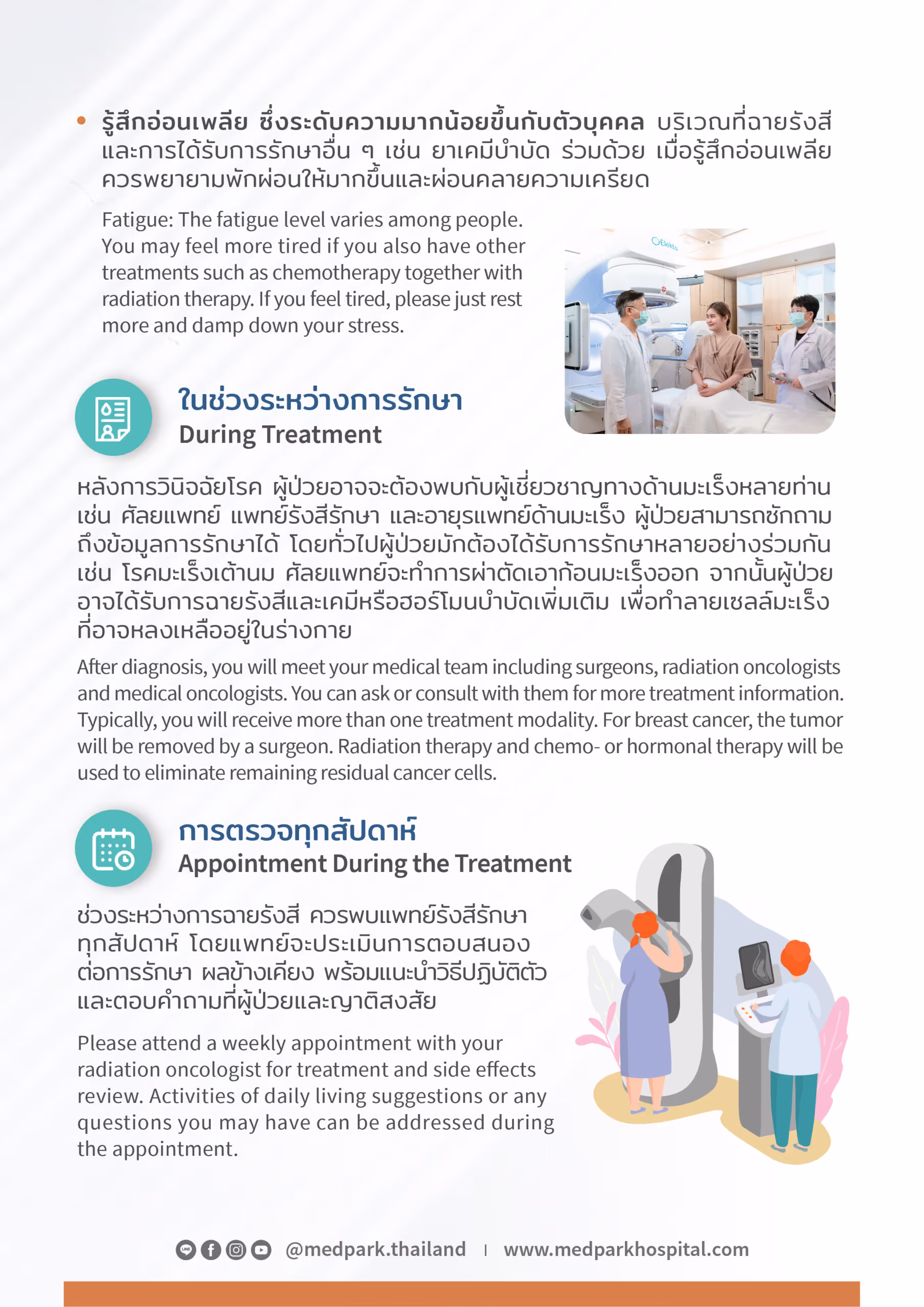 After diagnosis, you will meet your medical team including surgeons, radiation oncologists and medical oncologists. You can ask or consult with them for more treatment information. Typically, you will receive more than one treatment modality. For breast cancer, the tumor will be removed by a surgeon. Radiation therapy and chemo- or hormonal therapy will be used to eliminate remaining residual cancer cells.