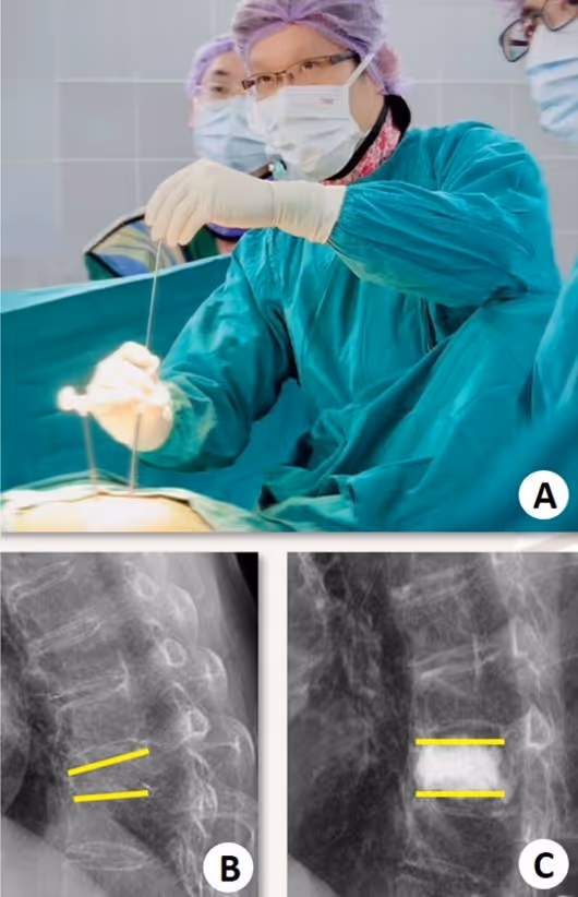 Image C: Vertebral height restoration of collapsed vertebra after balloon kyphoplasty with cement injection