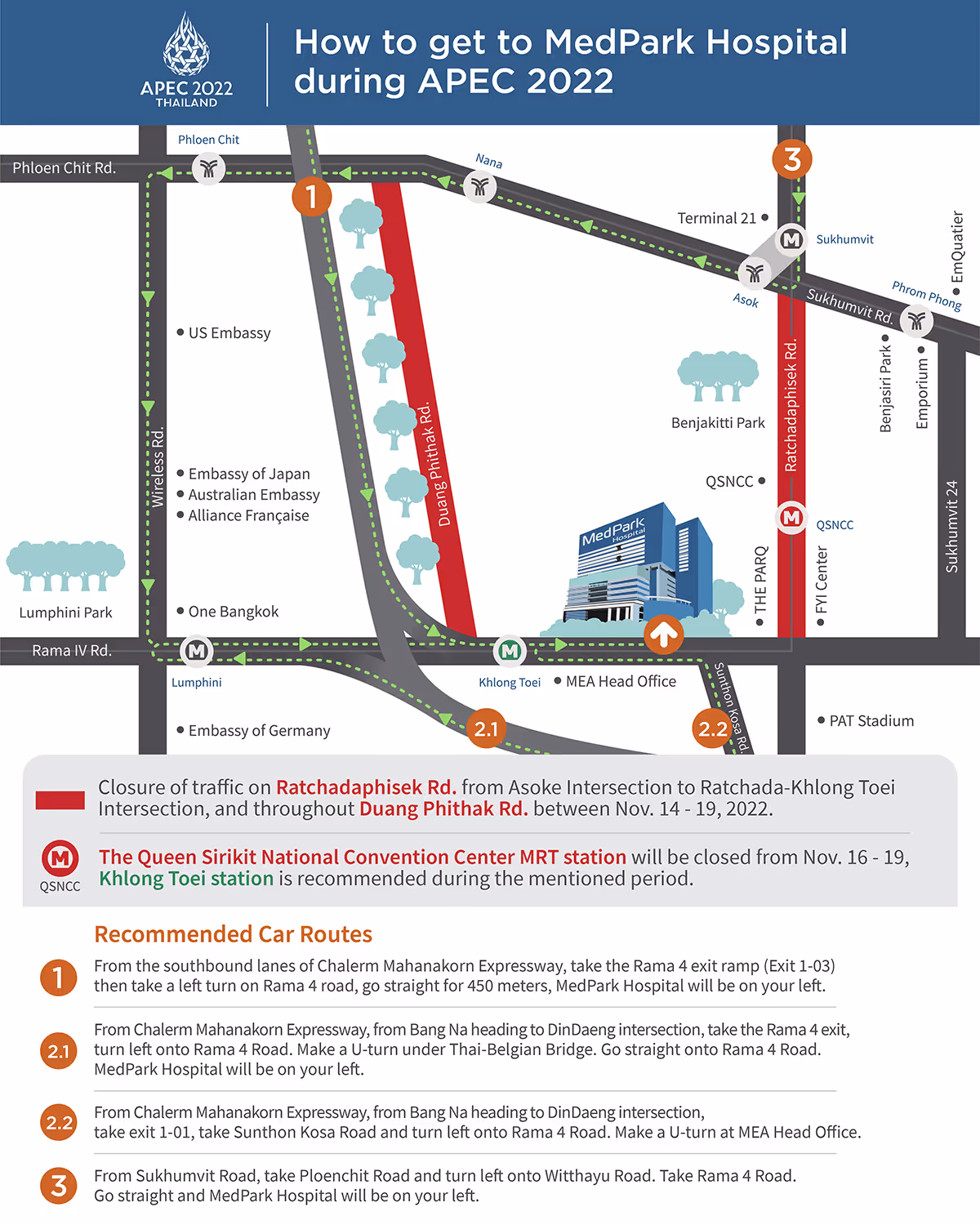 Due to the road closures from 14 to 19 November 2022 announced by Metropolitan Police Bureau, we would like to inform you the recommended routes to MedPark Hospital during APEC 2022.