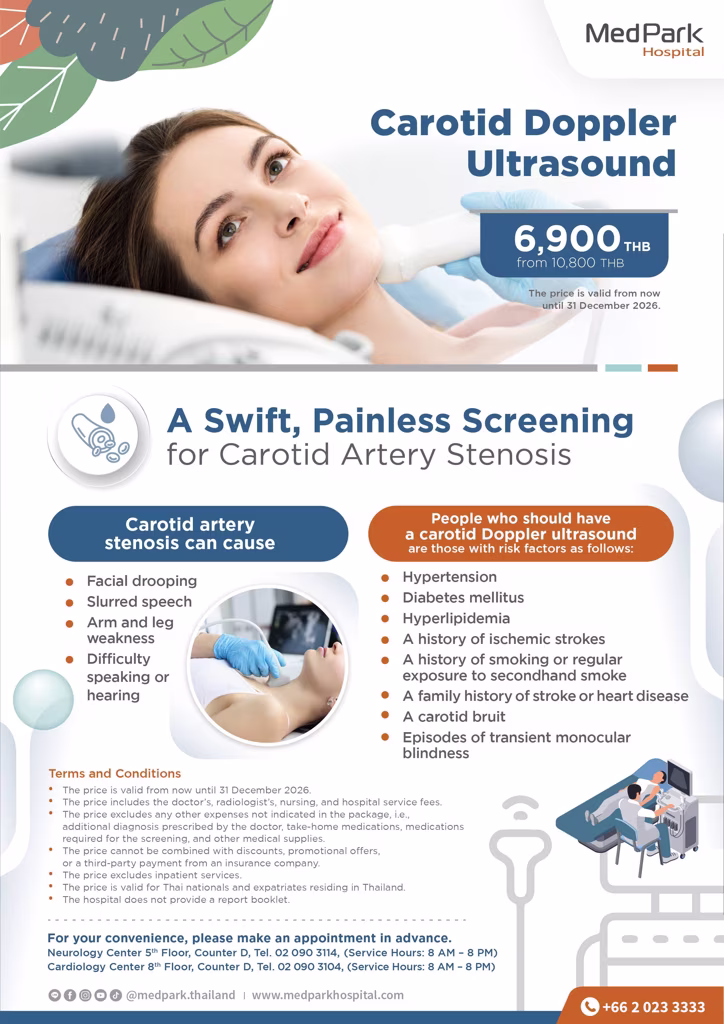 Today, carotid artery disease is detectable early and accurately through Doppler ultrasound, a non-invasive, quick, and painless procedure to assess blood flow and plaque buildup in the artery wall, narrowing its lumen. Patients do not need to fast or restrict water intake before the exam. Patients with the following conditions are at risk of carotid artery disease: