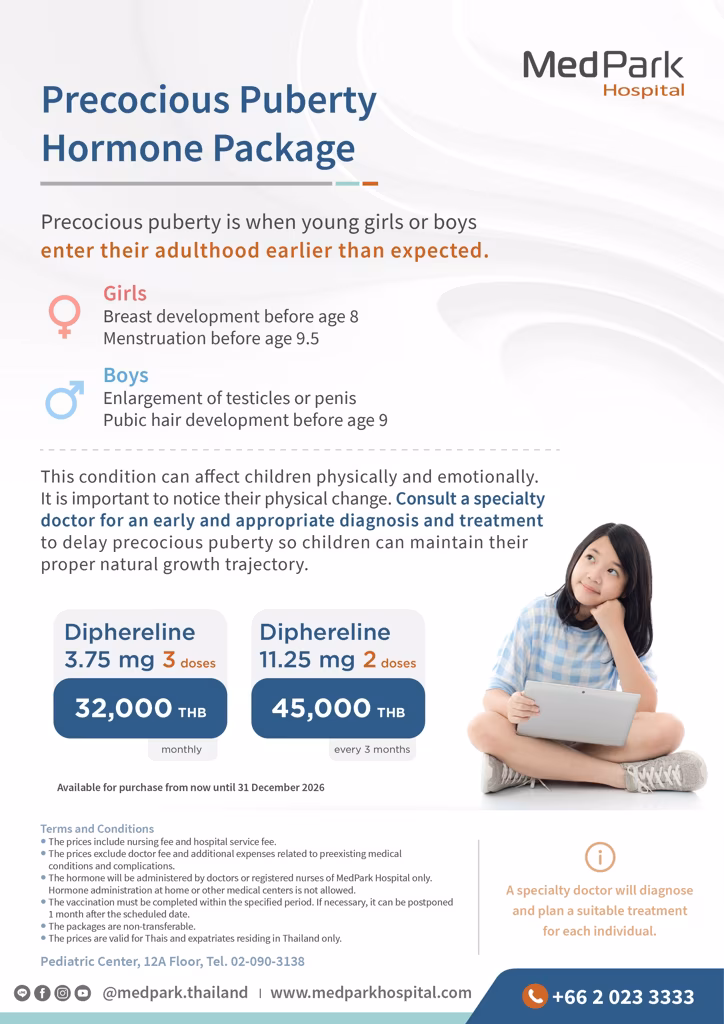 This condition can affect children physically and emotionally. It is important to notice their physical change. Consult a specialty doctor for an early and appropriate diagnosis and treatment to delay precocious puberty so children can maintain their proper natural growth trajectory.