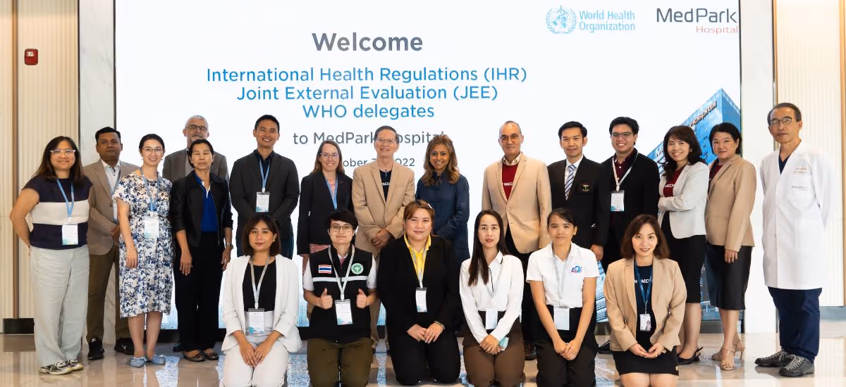 The Department of Disease Control, headed by Dr Chawetsan Namwat, Director of the Disease Control Division and Public Health Emergency and staff welcomed and escorted the assessor committee to the observational area to evaluate the country’s health security capacity in accordance with IHR (2005) Monitoring and Evaluation’s second step of Joint External Evaluation (JEE) on October 31, 2022.