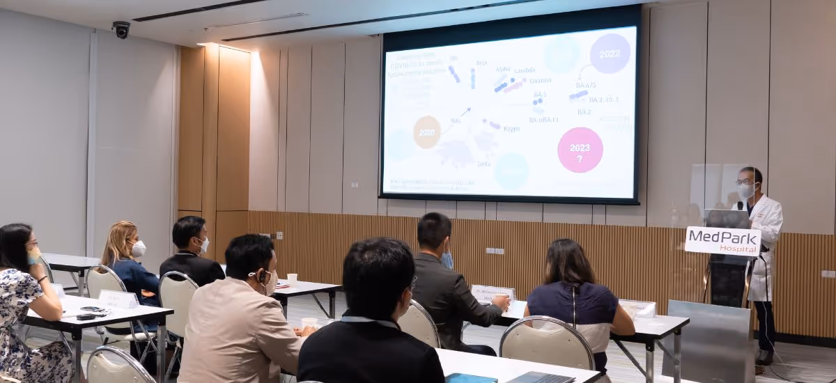 The assessor committee arrived at MedPark Hospital, Khlong Toei District, Bangkok to inspect the cooperation between private and public hospitals presented by Dr Pongpat Patanvanich, Managing Director of MedPark Hospital. The committee observed the hospital's service system including COVID-19 patient screening procedures, inpatient care, and COVID-19 vaccination for the public including young children.
