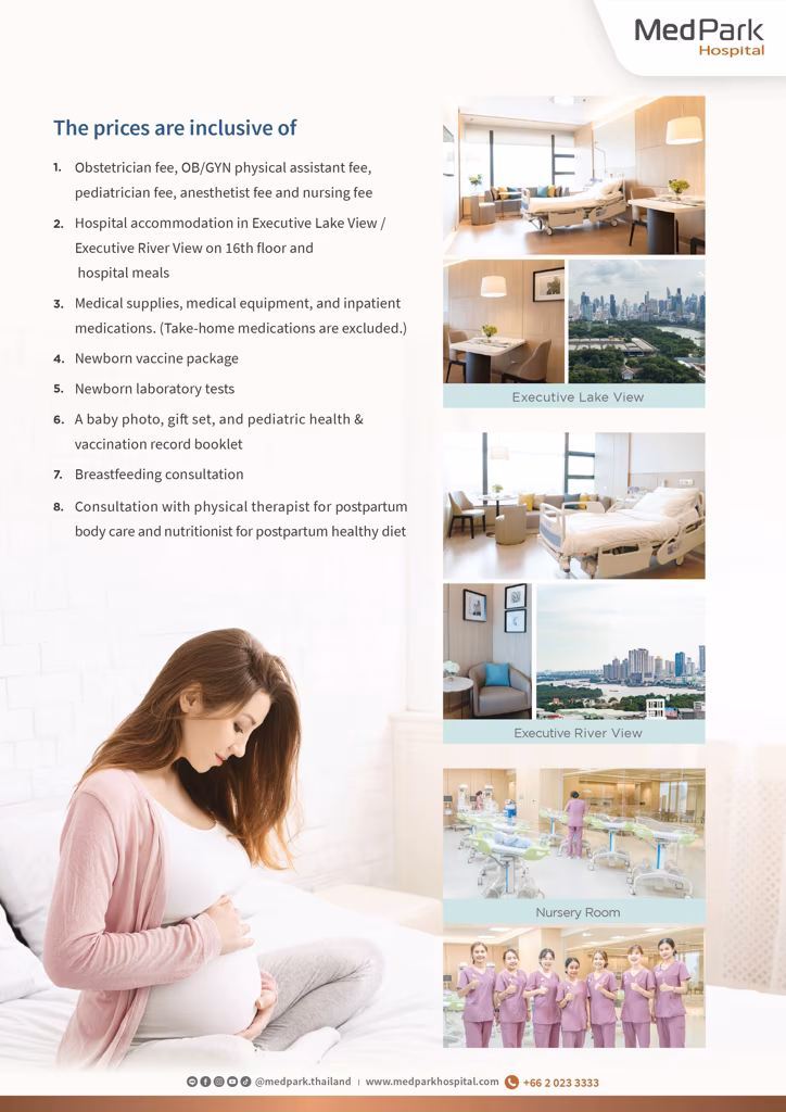 - 通常分娩パッケージにおいて無痛分娩(硬膜外麻酔または脊椎麻酔)を希望される場合は、パッケージ料金に20,000バーツの追加料金が発生します。