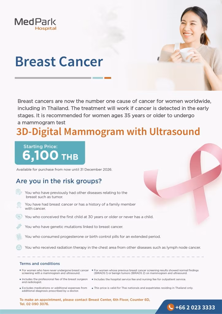 メドパーク病院でのデジタルマンモグラムおよび超音波検査乳がんは世界中の女性における主要な癌であり、タイでも例外ではありません。癌は早期に発見されることで治療が可能です。35歳以上の女性にはマンモグラム検査をお勧めします。