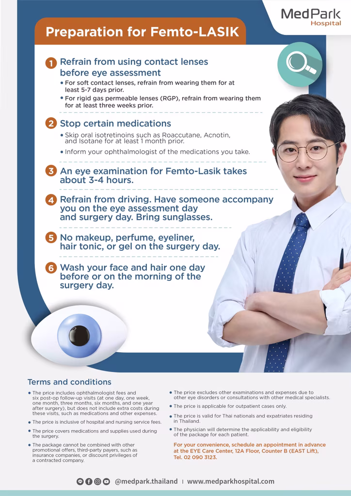 - 価格には眼科医の料金および手術後のフォローアップ訪問(手術後1日、1週間、1ヶ月、3ヶ月、6ヶ月、1年)が含まれますが、これらの訪問中の薬剤やその他の費用は含まれません。
