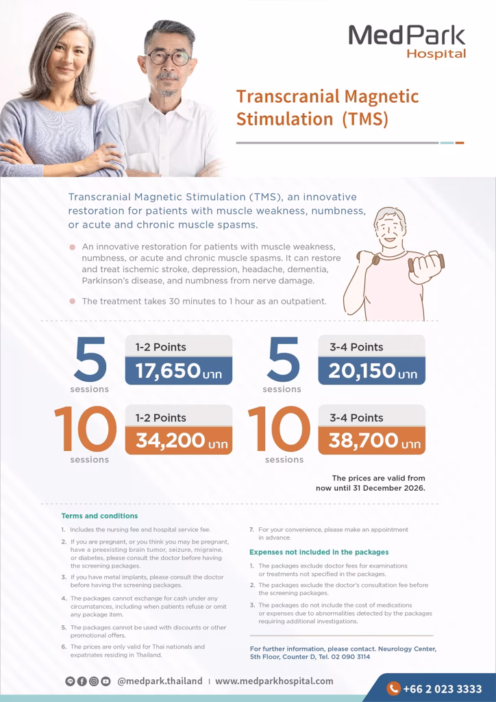 経頭蓋磁気刺激(TMS)は、筋肉の弱さ、しびれ、急性および慢性の筋肉痙攣に対する治療法であり、脳卒中、うつ病、頭痛、認知症、パーキンソン病、神経損傷によるしびれの回復や治療に役立ちます。治療は外来で30分から1時間程度です。