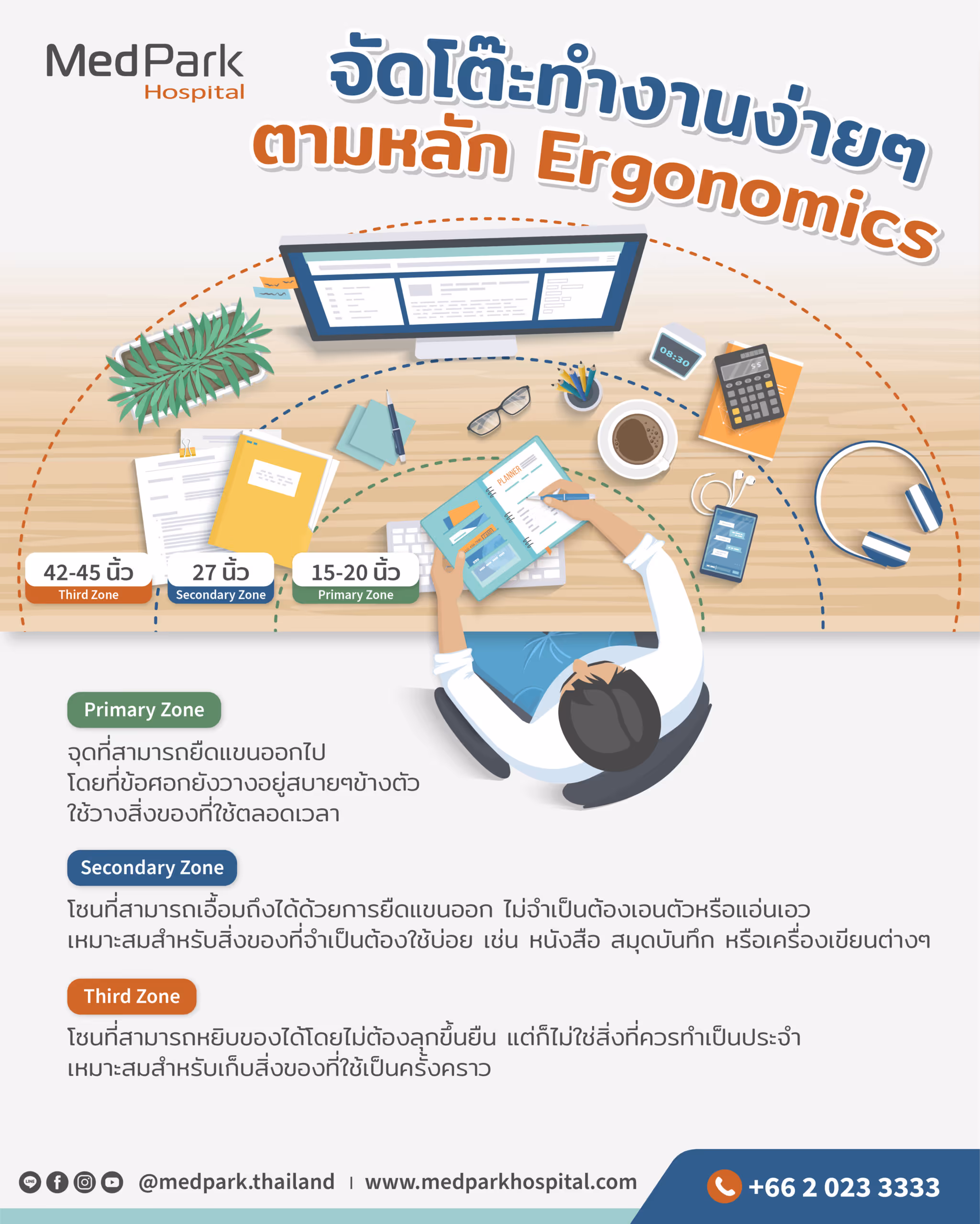การนั่งทำงานนาน ๆ อาจทำให้หลายคนเริ่มมีอาการปวดหลัง ปวดคอ ปวดตา รู้หรือไม่ว่าอาการเหล่านี้ไม่เพียงแต่จะนำไปสู่ โรคออฟฟิศซินโดรม เท่านั้นแต่อาจอันตรายจนเกิดภาวะหมอนรองกระดูกทับเส้นประสาท วันนี้ เมดพาร์ค ชวนทุกคนมาจัดโต๊ะทำงานให้ถูกต้องตามหลักการยศาสตร์ เพื่อปกป้องตัวเองจากโรคออฟฟิศซินโดรม