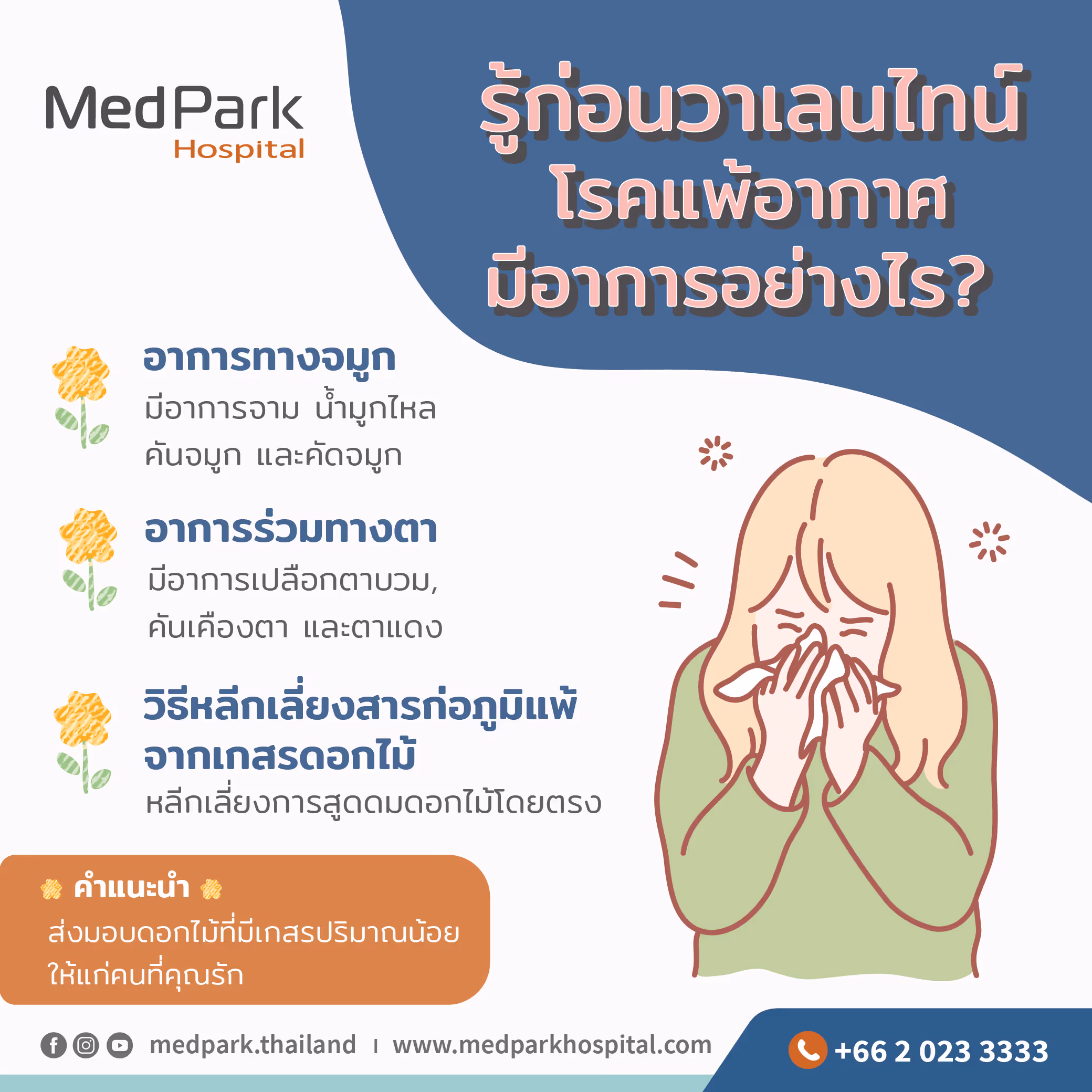 ในช่วงเทศกาลวาเลนไทน์นี้ ผู้ที่เป็นโรคแพ้อากาศ แนะนำให้หลีกเลี่ยงการสูดดมดอกไม้ เพราะว่าละอองเกสรในดอกไม้ อาจไปกระตุ้นปฏิกิริยาภูมิแพ้ของคุณได้