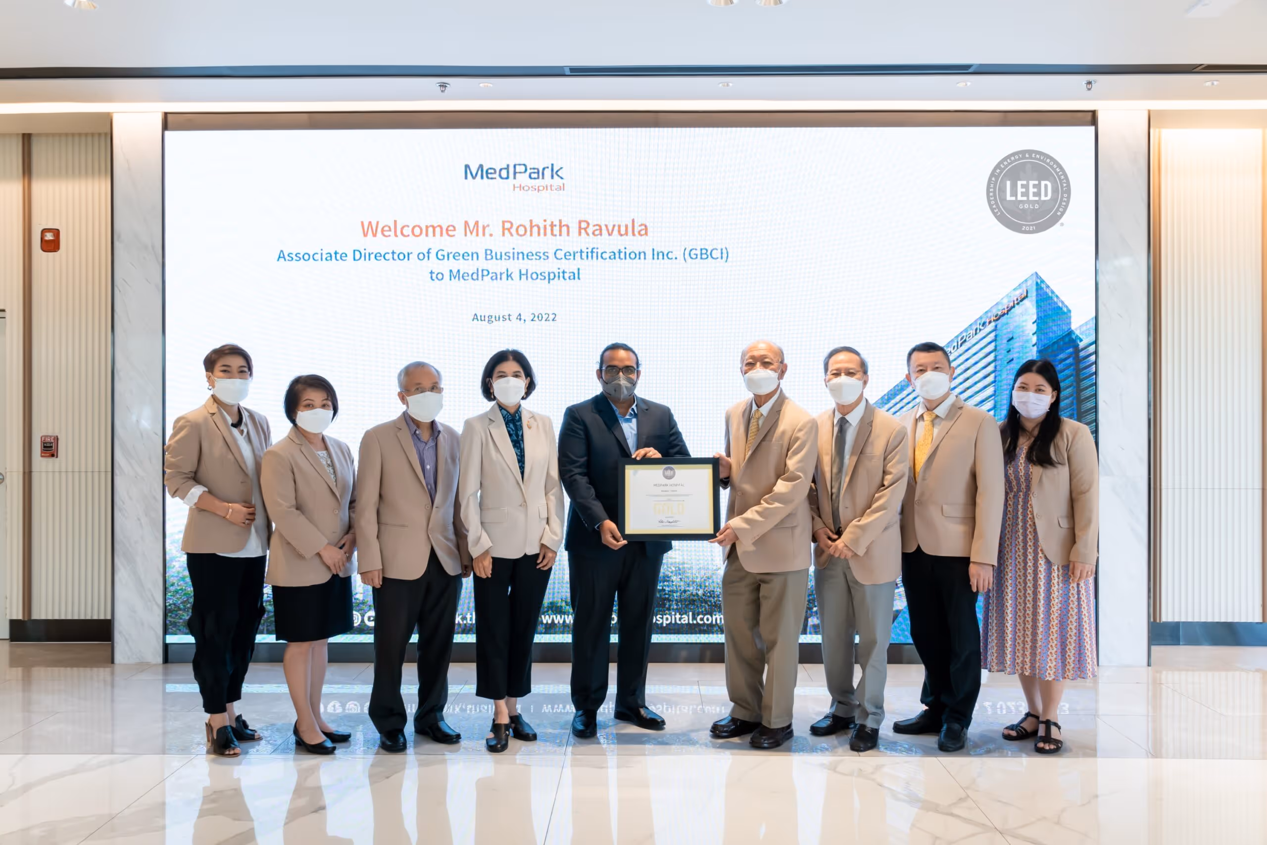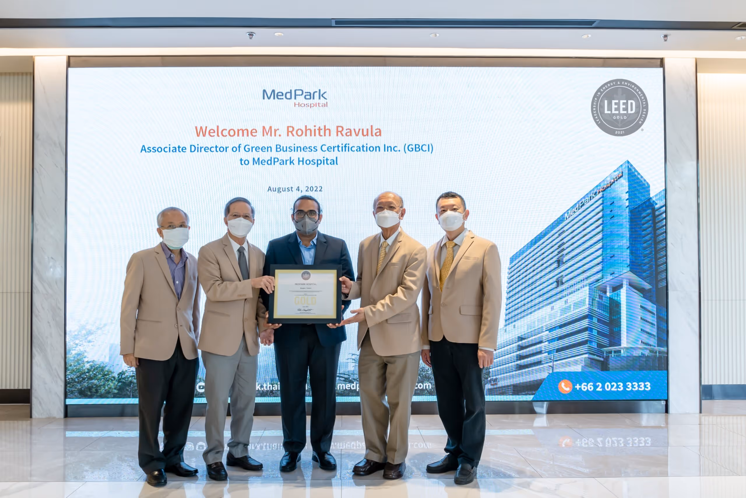 กรุงเทพฯ - วันที่ 4 สิงหาคม 2565 คณะผู้บริหาร รพ. เมดพาร์ค นำโดย ศ.นพ.สิน อนุราษฎร์ พร้อมด้วย นพ. พงษ์พัฒน์ ปธานวนิช ร่วมต้อนรับ มร. โรหิต ราวูล่า รองผู้อำนวยการ ฝ่ายพัฒนาตลาด - Green Business Certification Inc. ในการเดินทางมามอบใบประกาศนียบัตร LEED ระดับ Gold อย่างเป็นทางการ