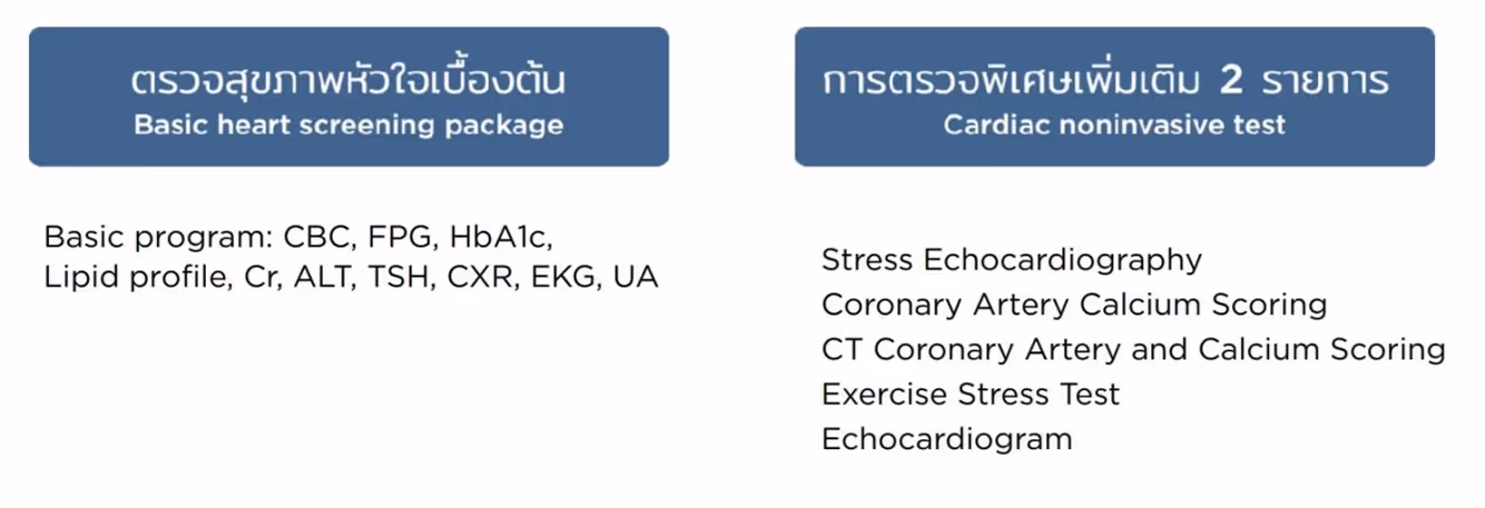 โดยแพทย์ผู้เข้ารับบริการ จะได้รับการตรวจสุขภาพหัวใจเบื้องต้น (Basic heart screening program) ร่วมกับเลือกการตรวจพิเศษเพิ่มเติม (Cardiac noninvasive test) 2 รายการ โดย แพทย์ผู้ชำนาญการด้านโรคหัวใจและหลอดเลือด จะเป็นผู้พิจารณาเลือกวิธีการตรวจที่เหมาะสม