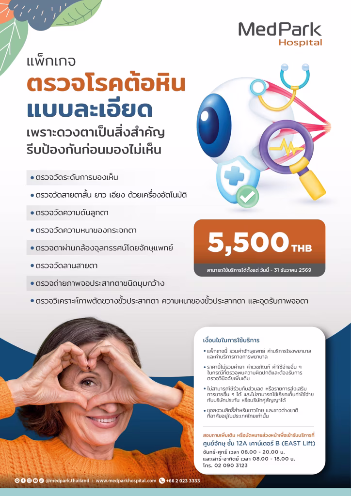 - สามารถติดต่อรับบริการได้ที่ คลินิกจักษุ โรงพยาบาลเมดพาร์ค ชั้น 12A เคาน์เตอร์ B