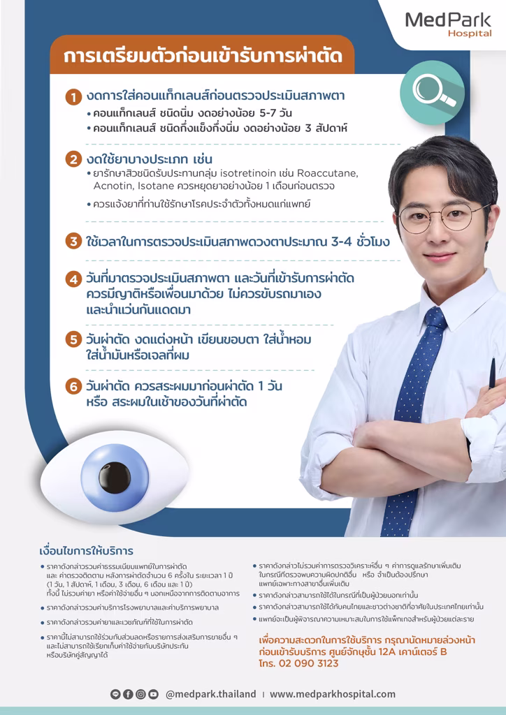- วันที่มาตรวจประเมินสภาพตาและวันผ่าตัด ควรมีคนมาด้วย ไม่ควรขับรถมาเอง และเตรียมแว่นกันแดดมา