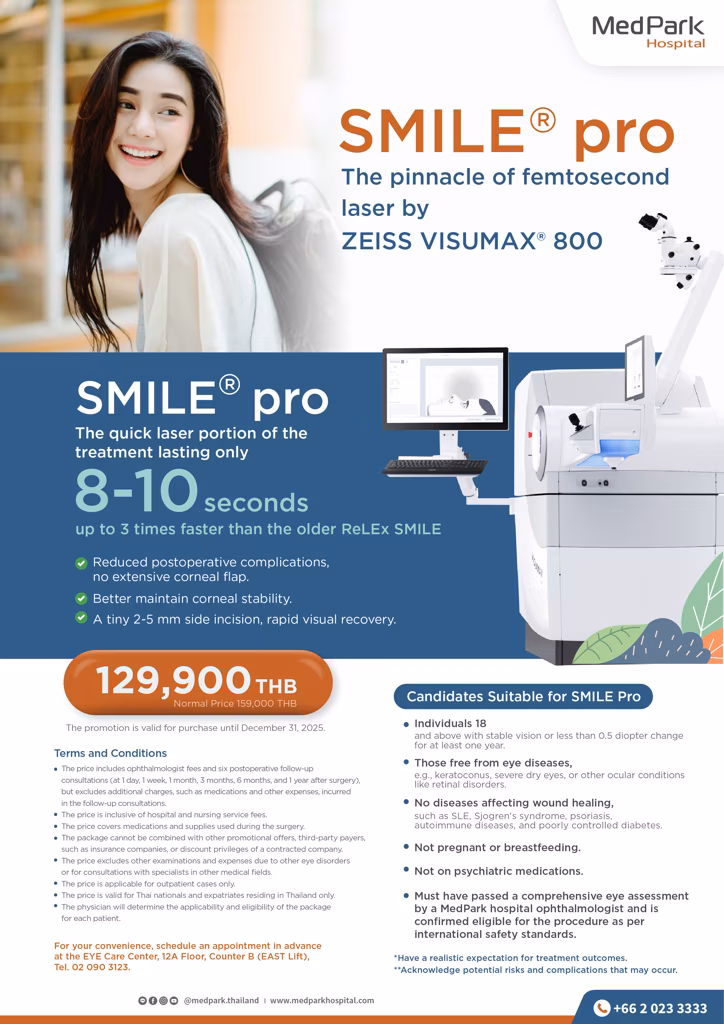 SMILE® pro เป็นการแก้ไข ภาวะสายตาผิดปกติด้วยเลเซอร์ที่ทันสมัยที่สุดในปัจจุบัน ไม่ต้องเฉือนเปิดฝากระจกตาแผ่นใหญ่เหมือนการทำเลสิค โดยใช้เลเซอร์แยกเนื้อภายในกระจกตาเป็นรูปร่างบางกลม (lenticule) แล้วนำออกผ่านแผลเล็กเพียง 2-5 mm. เป็นเทคโนโลยีใหม่ล่าสุดโดย ZEISS VISUMAX® 800 Femtosecond Laser