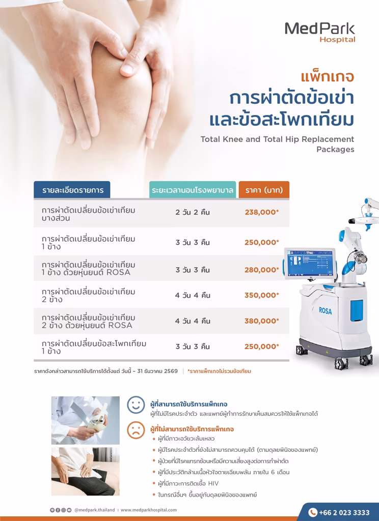 - ผ่าตัดเปลี่ยนข้อเข่าเทียม 1 ข้าง ด้วยหุ่นยนต์ ROSA (พักฟื้น 3 วัน 3 คืน)