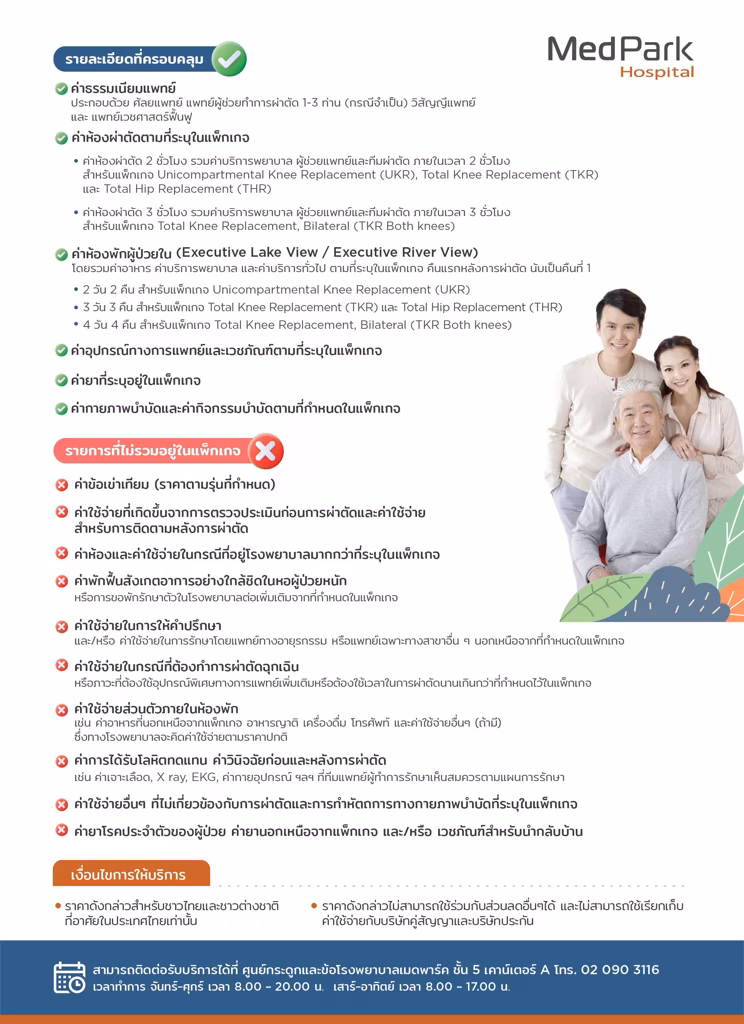 - ค่าห้องผ่าตัดตามที่ระบุในแพ็กเกจ- ค่าห้องผ่าตัด 2 ชั่วโมง รวมค่าบริการพยาบาล ผู้ช่วยแพทย์และทีมผ่าตัด ภายในเวลา 2 ชั่วโมงสำหรับแพ็กเกจ Unicompartmental Knee Replacement (UKR), Total Knee Replacement (TKR) และ Total Hip Replacement (THR)- ค่าห้องผ่าตัด 3 ชั่วโมง รวมค่าบริการพยาบาล ผู้ช่วยแพทย์และทีมผ่าตัด ภายในเวลา 3 ชั่วโมงสำหรับแพ็กเกจ Bilateral Total Knee Replacement และ Bilateral Unicompartmental Knee Replacement