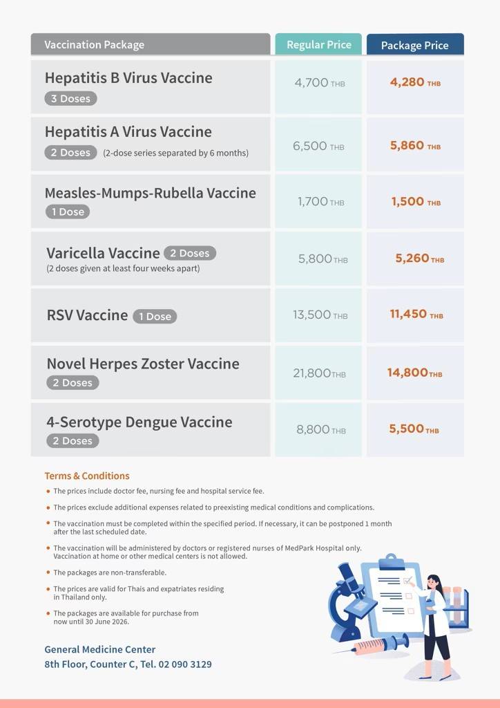 - ราคาดังกล่าวรวมค่าแพทย์ ค่าบริการพยาบาล และค่าบริการโรงพยาบาล (ตามจำนวนครั้งของการเข้ามารับวัคซีน)